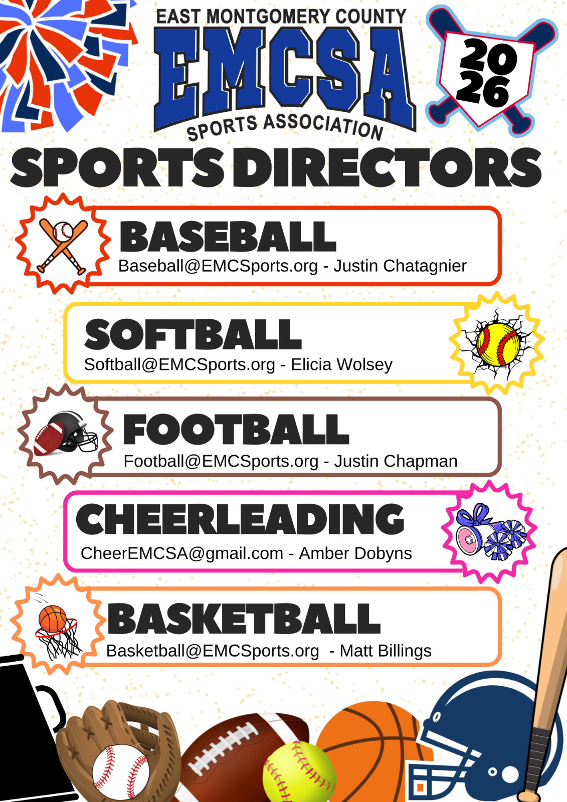 The East Montgomery County Sports Association (EMCSA) Board of Directors works to provide safe, affordable, and inclusive youth sports programs that foster teamwork, leadership, and personal growth. Through baseball, softball, basketball, football, and cheerleading, we strive to create a positive environment where every child can develop athletic skills, build confidence, and learn the values of sportsmanship and community.