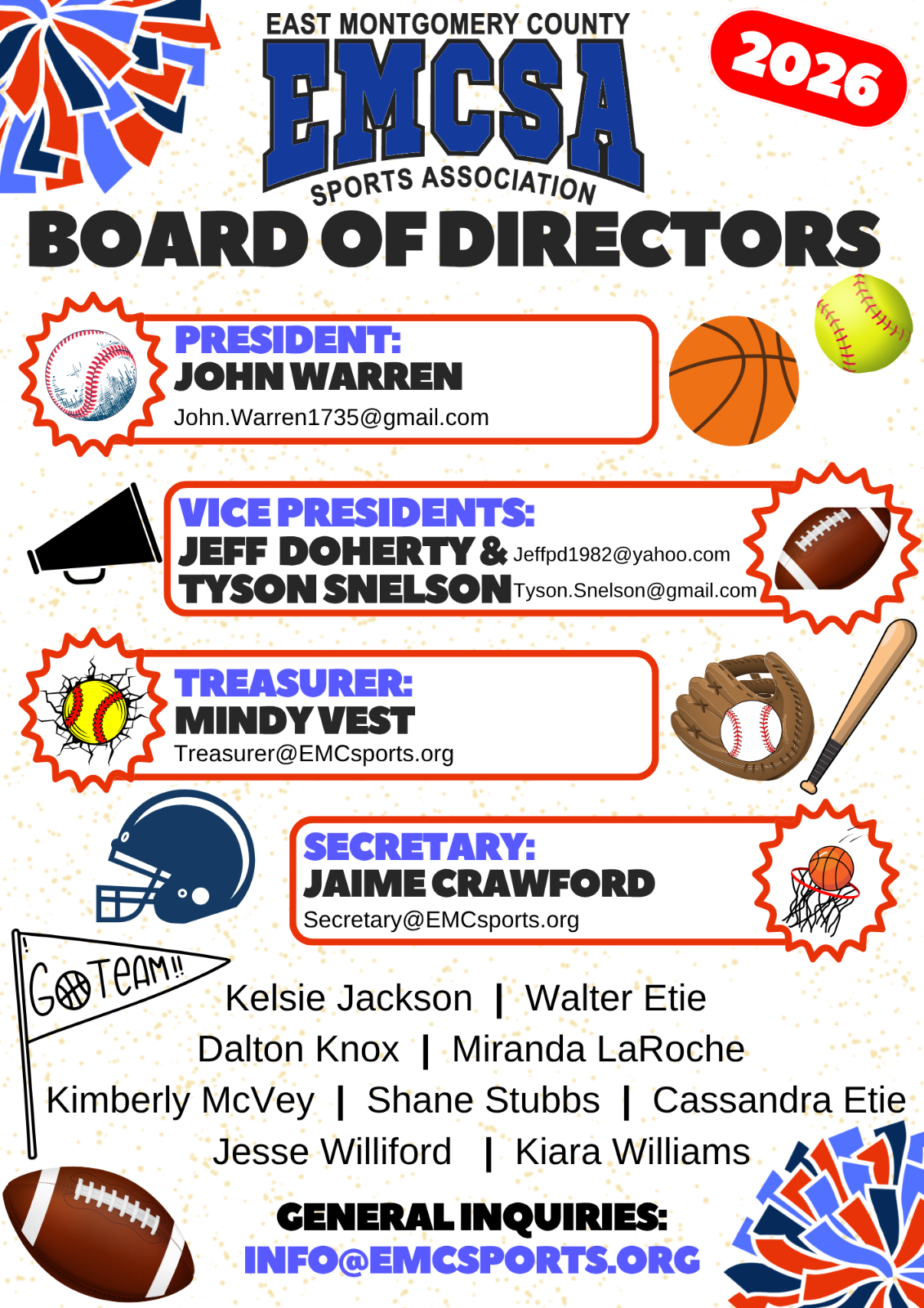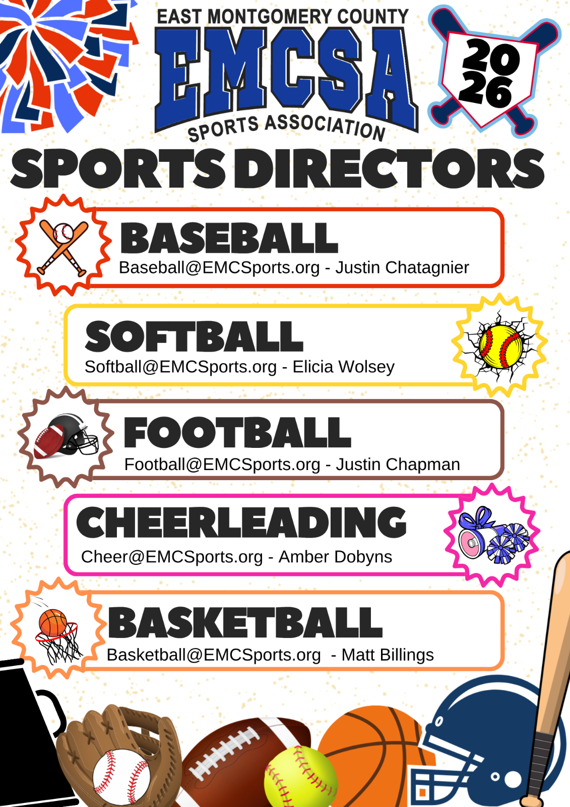 The East Montgomery County Sports Association (EMCSA) Board of Directors works to provide safe, affordable, and inclusive youth sports programs that foster teamwork, leadership, and personal growth. Through baseball, softball, basketball, football, and cheerleading, we strive to create a positive environment where every child can develop athletic skills, build confidence, and learn the values of sportsmanship and community.